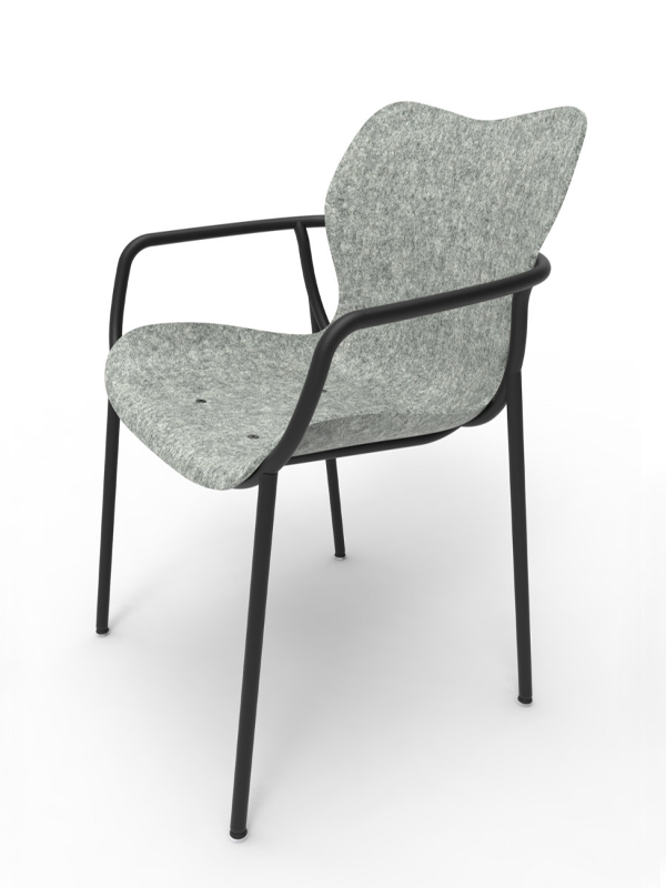 Sitzschalen aus geformtem Vliesmaterial auf Basis recycelter PET-Flaschen mit prägnanter Rückenkontur und modularem Stahlrohrrahmen.